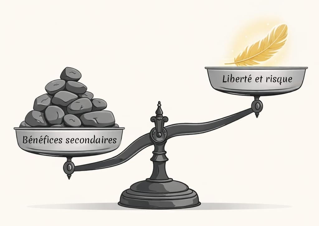 Renoncer à un schéma dysfonctionnant implique donc un véritable deuil. On ne pleure pas seulement la douleur, mais aussi les avantages qu’elle nous procurait. C’est une étape normale : il faut accepter de perdre cette vieille béquille pour apprendre à obtenir ce dont on a besoin autrement, avec plus de liberté, mais aussi plus de risques.