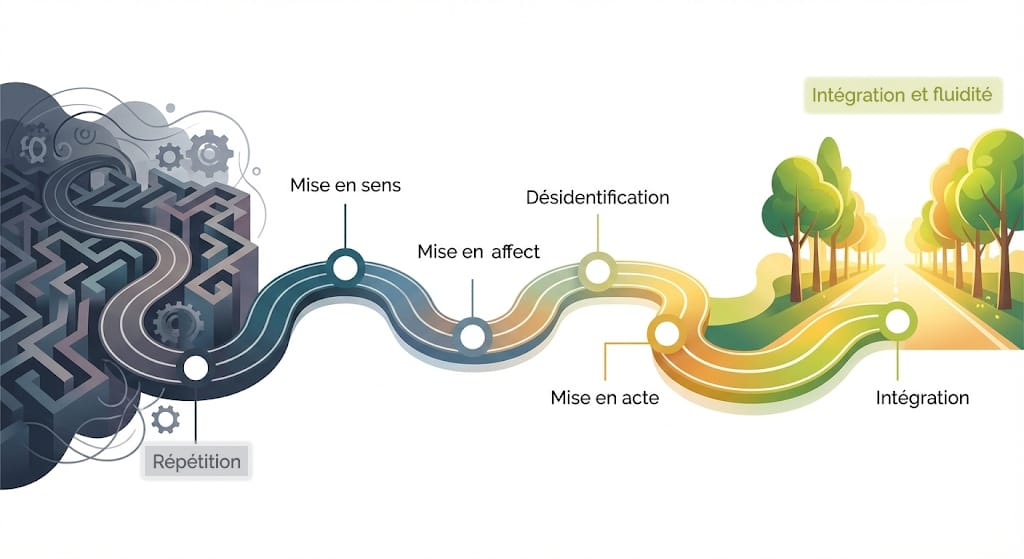 - Phase de mise en affect : On autorise la rencontre avec la charge émotionnelle brute (larmes, colère, sensations corporelles) pour la laisser circuler.
